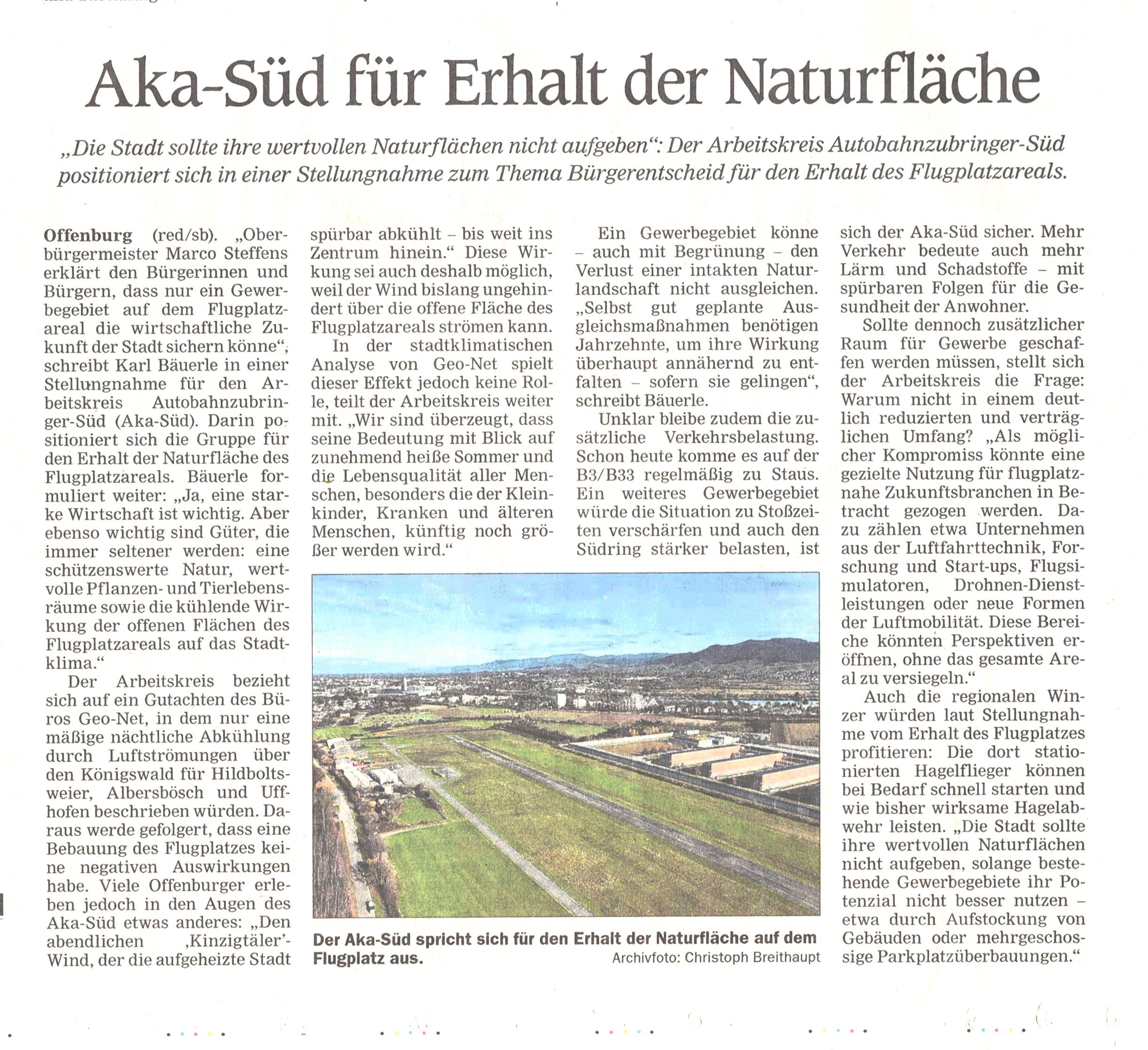 In einem Gutachten des Büros GEO-NET wird eine nur mäßige nächtliche Abkühlung durch Luftströmungen über den Königswald für Hildboltsweier, Albersbösch und Uffhofen beschrieben. Daraus wird gefolgert, dass eine Bebauung des Flugplatzes keine negativen Auswirkungen habe. Viele Offenburgerinnen und Offenburger erleben jedoch etwas anderes: den abendlichen „Kinzigtäler“-Wind, der die aufgeheizte Stadt spürbar abkühlt – bis weit ins Zentrum hinein. Diese Wirkung ist auch deshalb möglich, weil der Wind bislang ungehindert über die offene Fläche des Flugplatzareals strömen kann. In der stadtklimatischen Analyse von GEO-NET spielt dieser Effekt jedoch keine Rolle. Wir sind überzeugt, dass seine Bedeutung mit Blick auf zunehmend heiße Sommer und die Lebensqualität aller Menschen besonders die der Kleinkinder, Kranken und älteren Menschen künftig noch größer werden wird.